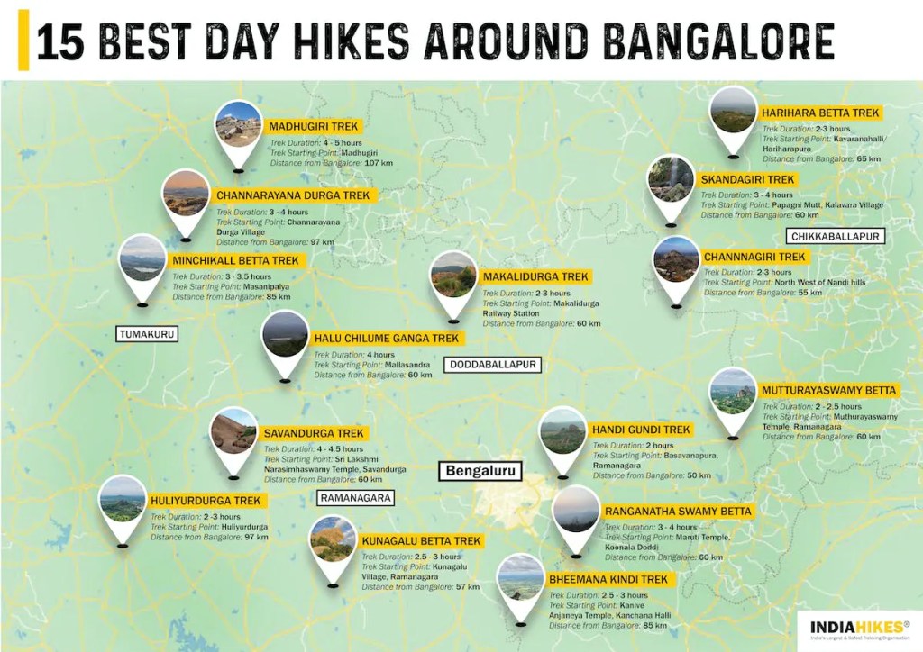 The second location would be one of the many trekking spots listed a short drive away from Bangalore. The Channarayanadurga Trek, Channakeshava Betta, Makalidurga Trek, RanganathaSwamy Betta or any of the treks listed in the infographic below. We’ve never been to any of these locations. And the reason is the same as above, its right there, we’ve just never slotted it in.