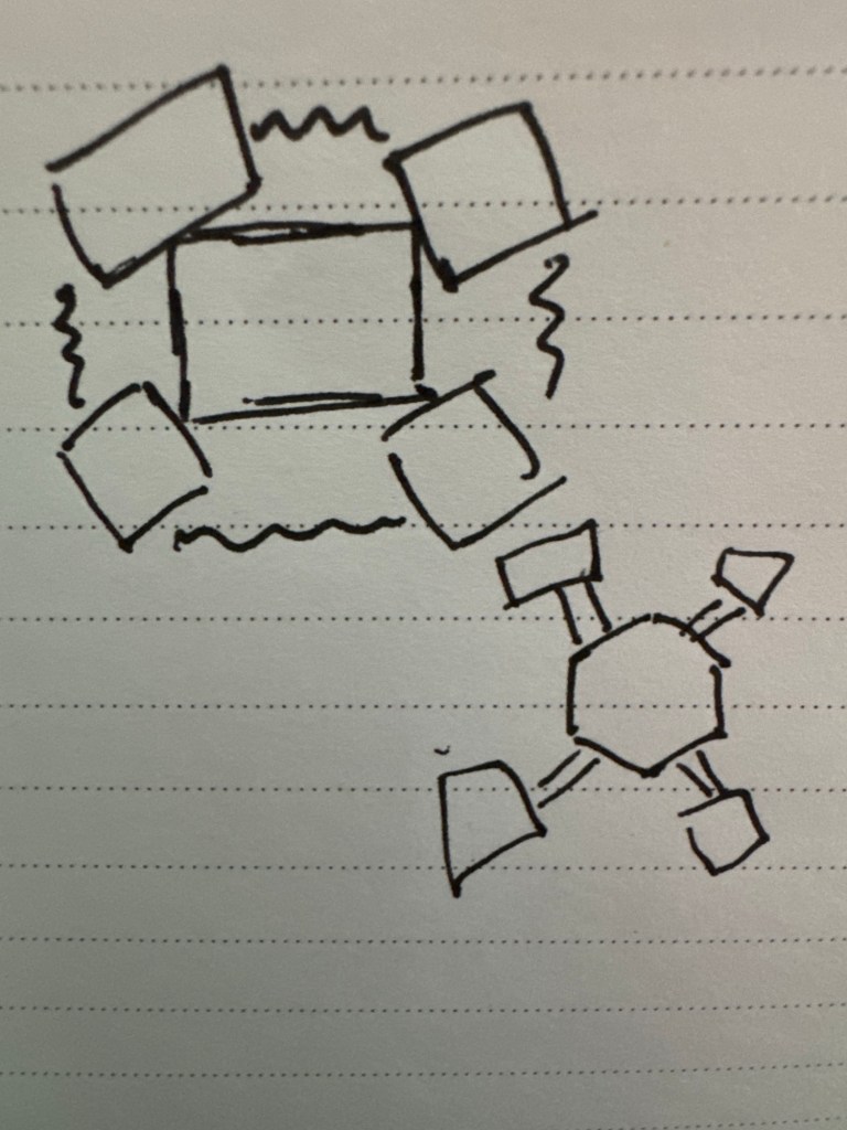 Living – the living area will be open to a central courtyard open to the sky with a skylight. Around this will be the kitchen, the lounge area, the dining area and the den. There will be stairs on either side of the courtyard that goes up one floor and corridors leading to bedrooms one in each direction. If the courtyard is a square or hexagon there would be one room at the edges. Have attached a rough (I mean it) sketch of either of these designs. Each room has its own balcony looking outward corridors and doors are enclosed with roof and hence are part of the interiors of the house. Each room has one set of tall picture windows facing the outside and balcony on the other side.